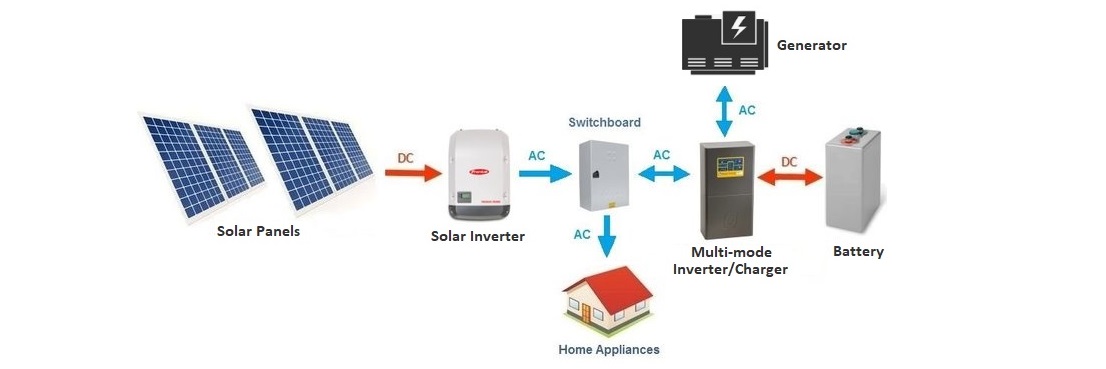 The DC electricity from the panels or/and battery passes through the DC distribution network to an inverter, which converts the DC electricity into AC for single/three phase operation by using state of art technology with MOSFET/IGBT methodology and fed through A/C distribution system linked to the load.
